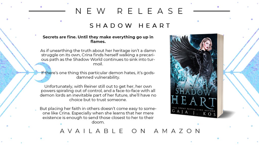 SHADOW HEART is the third novel in the suspenseful urban fantasy series with kickass assassins, sinfully hot demons, eye-candy vampires, and a steamy polyamorous romance you won’t want to miss!